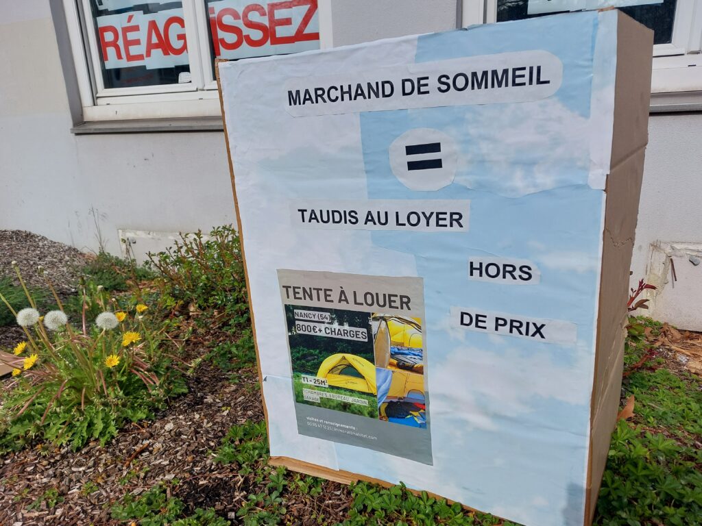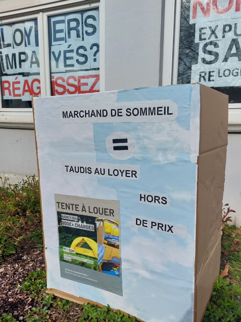 Nous demandons collectivement et solidairement : l’arrêt des expulsions locatives sans relogement et l’arrêt des coupures d’énergie par le respect de la dignité humaine, la facilitation de la prise en charge des impayés par les dispositifs d’aide, la non-récupération des indus CAF sur les aides au logement, la conservation des APL versées par la CAF en cas de non décence dans le logement HLM à l’instar du procédé existant sur le parc privé, la réquisition des logements vides (plus de 9000 sur Nancy), la mise en place d’espaces communs au pied de toute nouvelle construction d’immeuble, l’encadrement des loyers et la revalorisation des aides au logement, la garantie d’un revenu décent à l’ensemble des ménages.